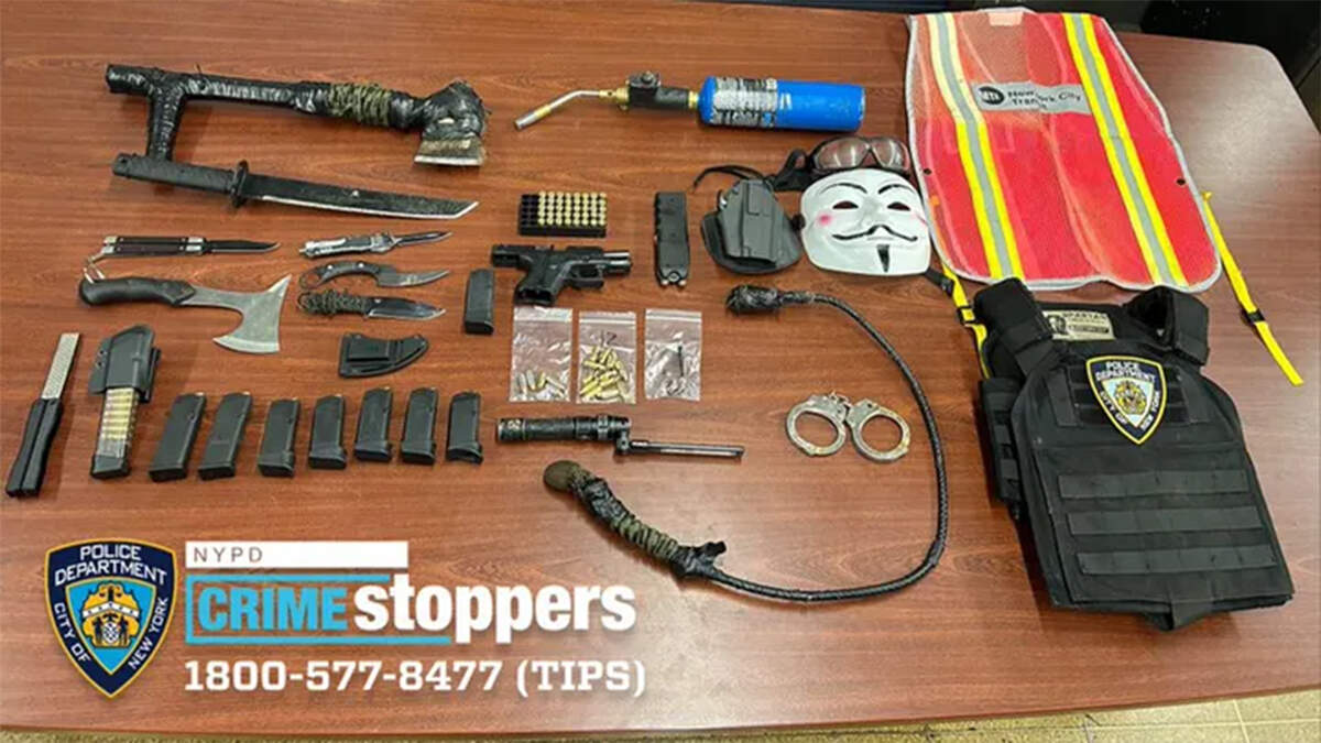 During the traffic stop, officers uncovered numerous weapons in the car, including a 9mm pistol, eight loaded magazines, two axes, several knives, a stun gun, a weighted whip, an expandable baton, NYPD body armor, a red and yellow MTA vest in his vehicle, and a Guy Fawkes mask.